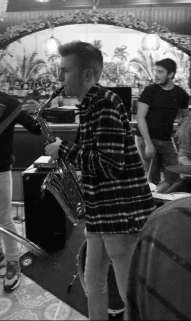 I thoroughly enjoyed university life, getting involved in several societies, meaning I would host my own show (with two others) on the student Xpress radio station, and perform with the student-led Saxophone Choir. I also enjoyed playing saxophone with the band on one of our music 'Jam Nights', as pictured below!